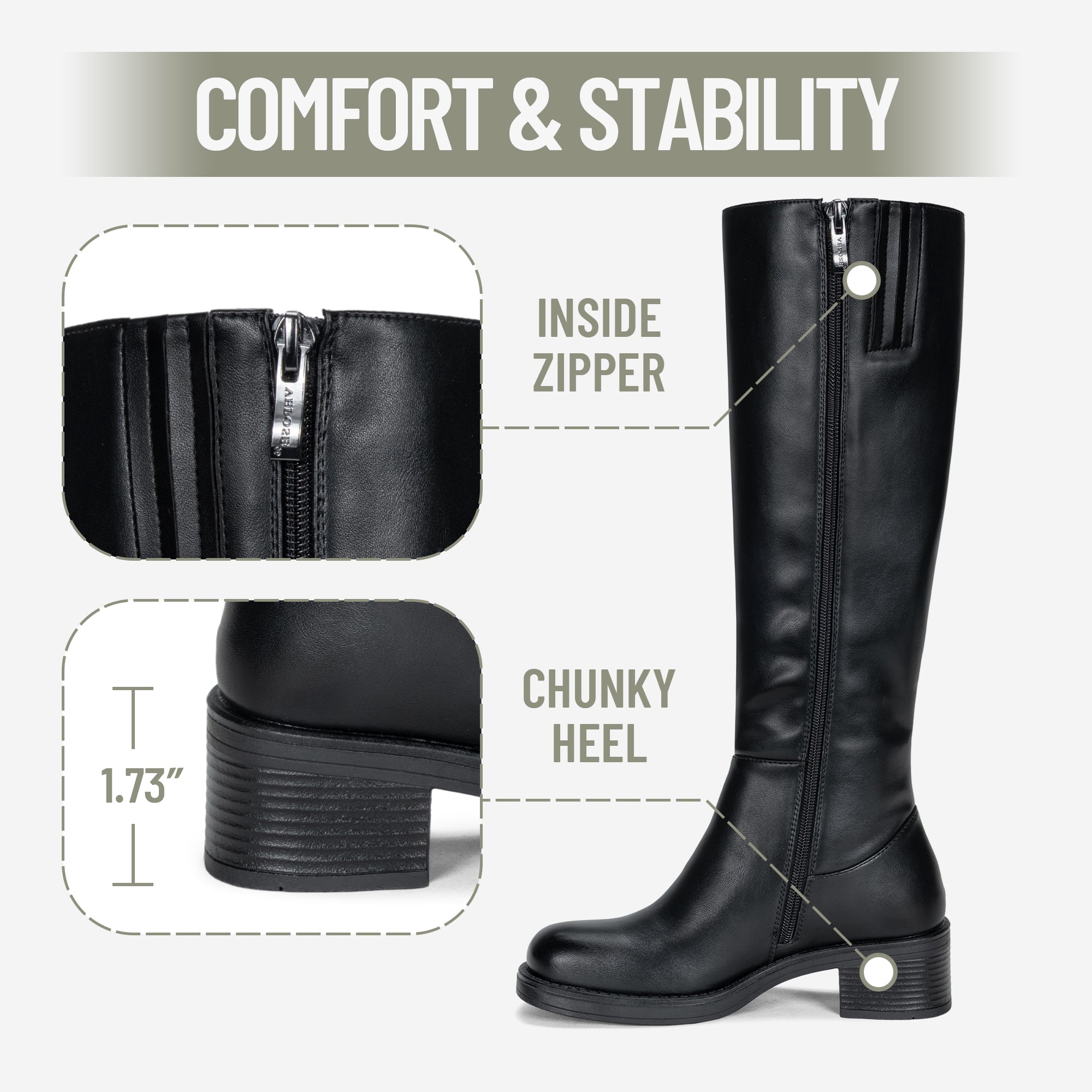 - Comfortable:These tall boots feature a soft, skin-friendly lining and a supportive 1.3-inch heel, ensuring lasting comfort even during extended wear.