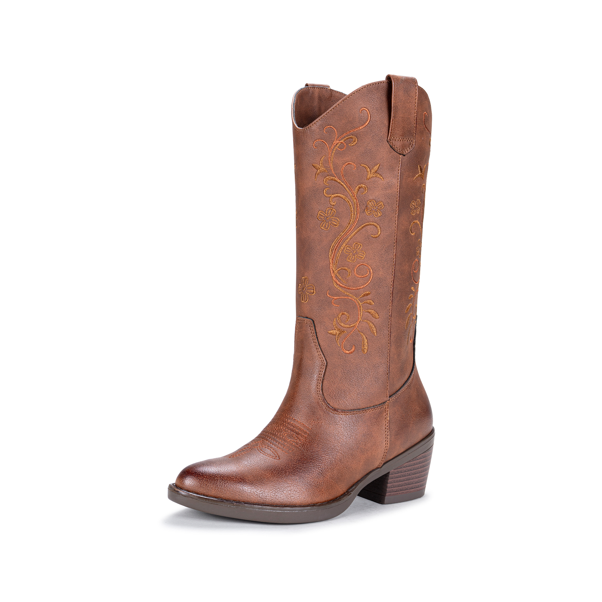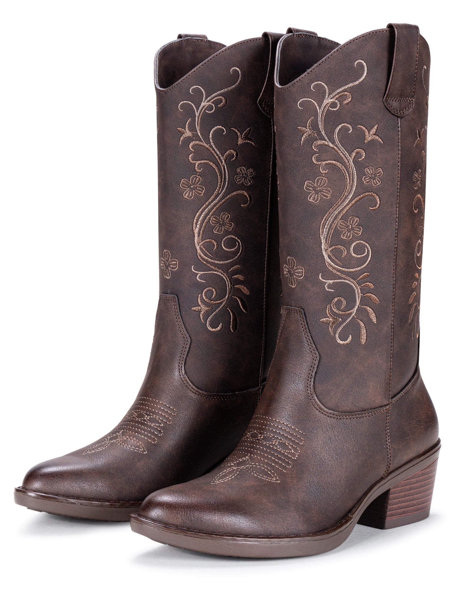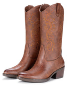 - Cowboy Style: These vintage mid-calf brown boots are designed with stitched embroidery on the shaft and a stylish pointed toe, offering a blend of western country style and modern casual flair