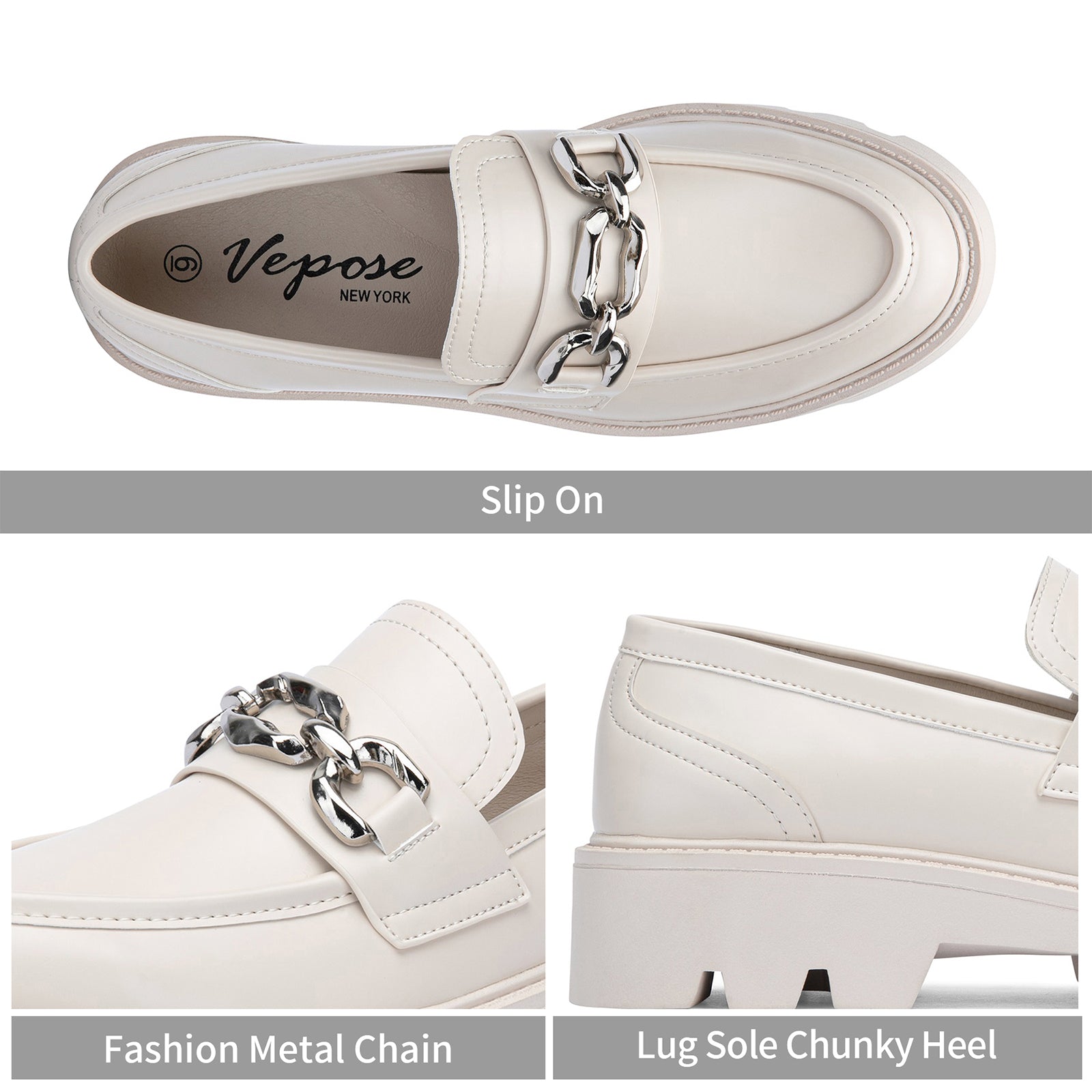 Vepose Women's 8081 Fashion Slip On Chunky Heel Casual Loafers Shoes Round Toe with Chain